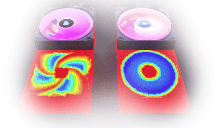 Les lamelles anti-vortex du cadre situées derrière les pales du ventilateur concentrent le flux d'air dans un cône étroit pour un refroidissement plus efficace en tant que ventilateur de boîtier ou une meilleure dissipation de la chaleur en tant que ventilateur de radiateur.