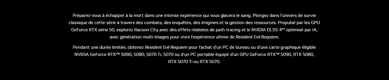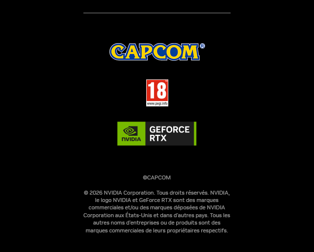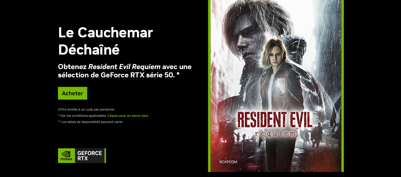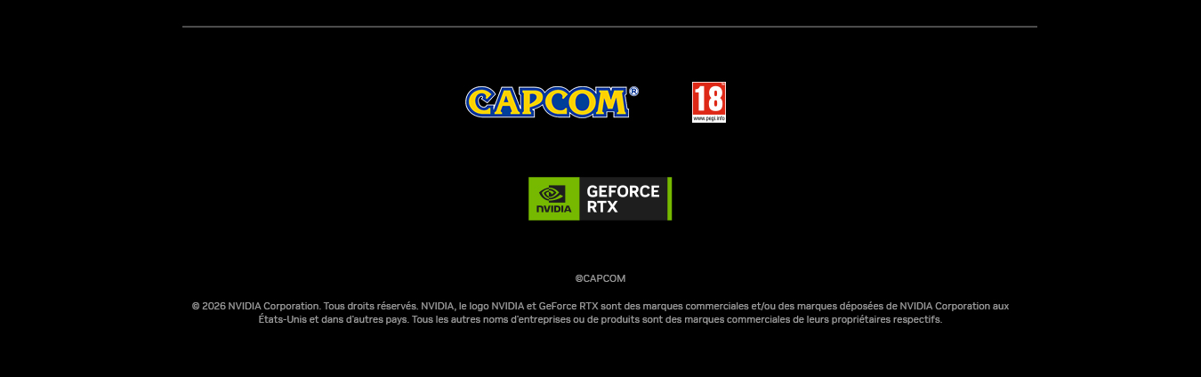 Cette offre ne peut pas être remplacée, échangée, vendue ou utilisée contre de l'argent ou contre d'autres biens ou services. Les taxes de vente applicables localement sont à la charge des utilisateurs. Cette offre ne peut pas être combinée avec une autre offre spéciale, une autre carte "Game Time" ou toute autre opération promotionnelle. Sous réserve de disponibilité. Quantités limitées. Les détaillants, les distributeurs et les employés de NVIDIA, NVIDIA, Capcom Capcom Co., Ltd. et de leurs agences/affiliés ne peuvent pas bénéficier de cette offre. Cette offre n'est pas applicable si des législations locales s'y opposent ou la limitent. Cette offre est limitée à une seule personne par transaction. Le code permettant de bénéficier de cette offre sera fourni aux utilisateurs lors de l'achat du produit NVIDIA éligible. Le jeu doit être activé sur un PC équipé d'une carte graphique éligible. Les clients doivent être âgés de 18 ans et plus pour bénéficier de l'offre. Restrictions locales : certains codes sont uniquement valables dans leurs pays ou régions d'achat. Veuillez utiliser votre code dans le pays ou la région éligible. Les revendeurs agréés de PC portables équipés d'un GPU éligible sont également susceptibles de proposer cette offre. Veuillez vérifier la description du produit en boutique ou sur le site du revendeur pour vous assurer que vous achetez un modèle éligible.
