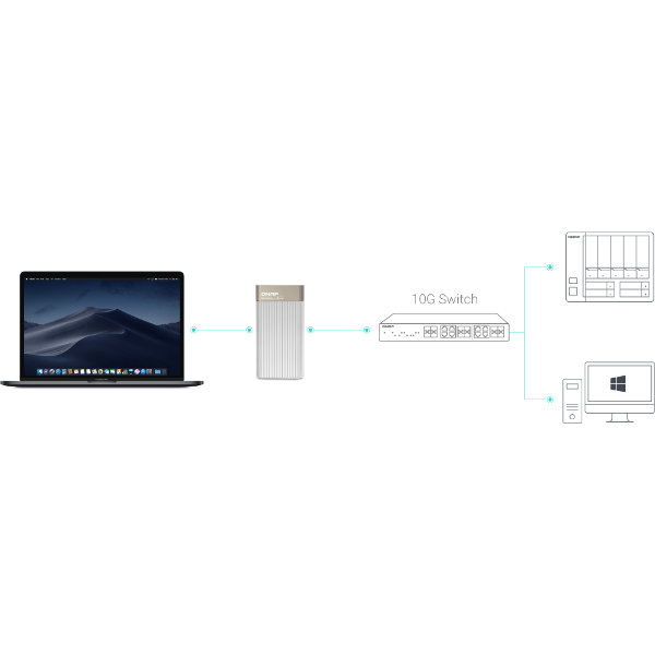 Sa conception moderne arbore un design réussi au look métallique. Il ne nécessite pas d'alimentation externe ce qui le rend très mobile et il intègre des rainures discrètes qui assurent une dissipation thermique optimale. Plug & Play, il suffit de connecter le QNA-T310G1S à votre ordinateur et de le relier à un appareil 10GbE pour bénéficier instantanément d'une connexion ultra-rapide.