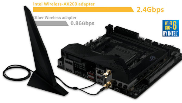La STRIX B550-I GAMING possède enfin un module Intel WiFi 6 AX200 qui augmente la bande passante maximale pour atteindre un débit de connexion phénoménal allant jusqu'à 2,4 Gb/s.