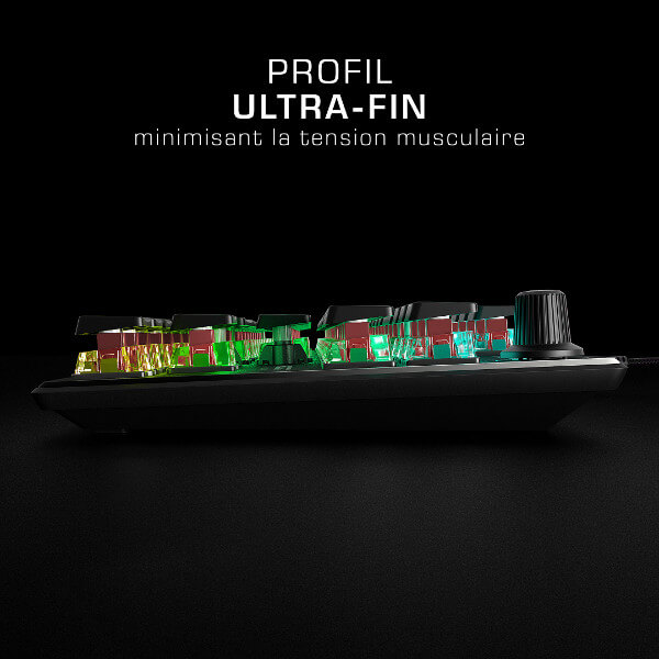 Son format est de type TKL (Ten-Key-Less), comprenez par là qu'il n'a pas de pavé numérique ! Mettez à profit ce format réduit pour gagner en place sur votre bureau ou pour l'emmener en LAN facilement !
