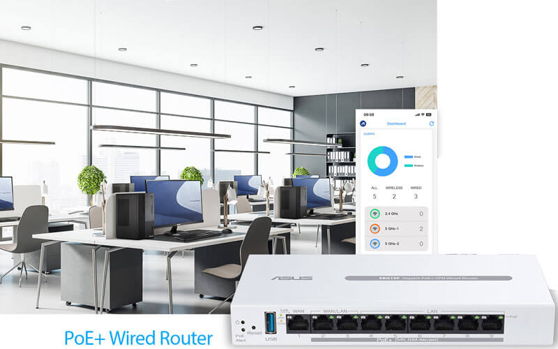 Le ASUS ExpertWiFi EBG19P est un routeur VPN Gigabit conçu pour offrir une connectivité haut débit. Grâce à ses multiples ports WAN, son VPN intégré et son contrôle intuitif, il s'adapte parfaitement aux exigences des réseaux d'entreprise.