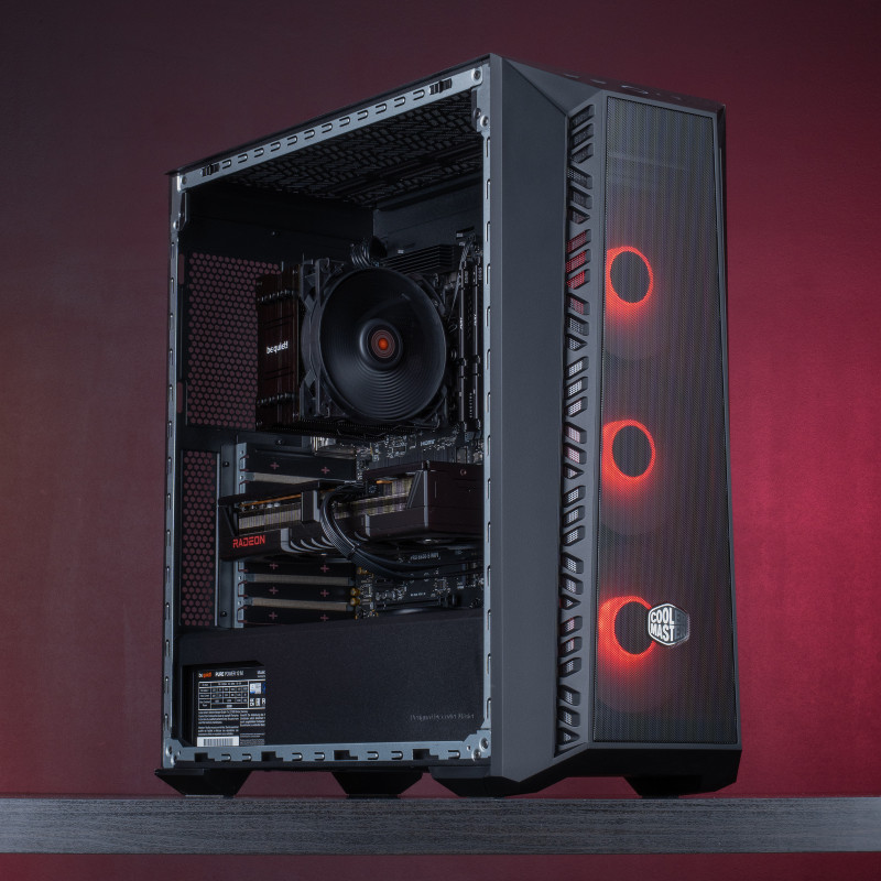 Ce beau PC Omnislash prend place dans un boitier Cooler Master MB520 dans sa version "mesh" pour laisser entrer un maximum d'air frais via ses 3 ventilateurs ARGB. Le processeur est quant à lui refroidi par le très efficace ventirad be quiet! Pure Rock 2.