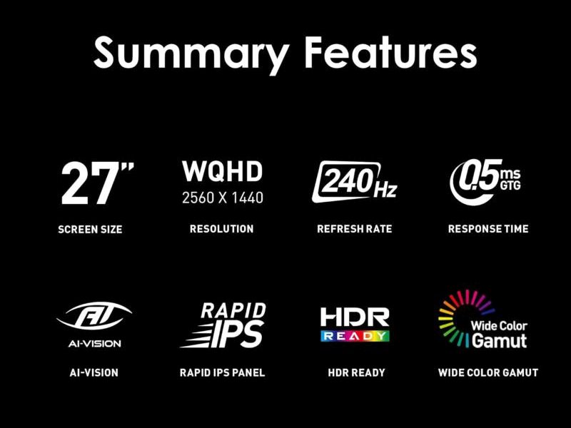 Écran PC 27", Rapid IPS, 16:9, 2560 x 1440 pixels, 0.5 ms, 240 Hz, HDMI/DisplayPort