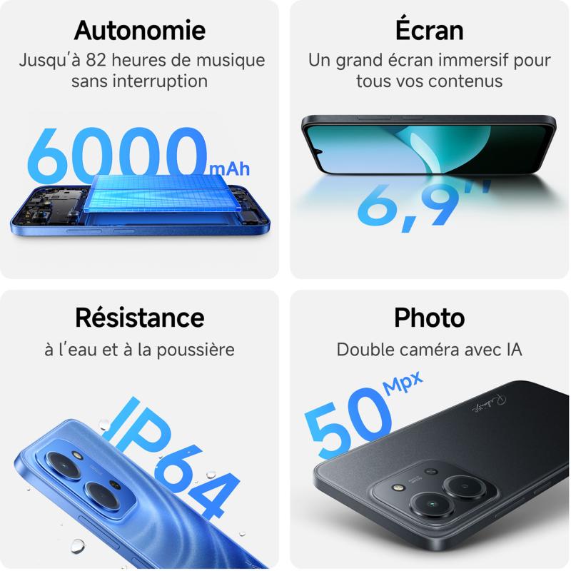 Le smartphone Xiaomi Redmi 15C se démarque par sa batterie longue durée de 6000 mAh capable d’offrir jusqu’à 82 heures d’utilisation et par son grand écran LCD HD+ 6,9’’ avec rafraîchissement jusqu’à 120 Hz pour une fluidité visuelle remarquable. Pensé pour durer et accompagner toutes vos activités, il conjugue style, confort et robustesse avec une résistance IP64. Propulsé par le MediaTek Helio G81-Ultra et jusqu’à 8 Go de RAM, il gère sans peine vos applications, vos jeux et votre multitâche. Son stockage extensible jusqu’à 1 To via microSD permet de conserver tous vos fichiers, photos et vidéos sans compromis.