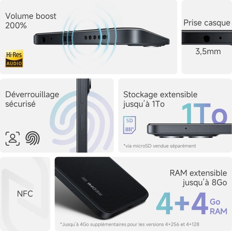 Le smartphone Xiaomi Redmi 15C 5G allie puissance et élégance avec son écran immersif 6,9" 120 Hz, son processeur MediaTek Dimensity 6300 et sa double caméra AI 50 MP. Sa batterie longue autonomie de 6 000 mAh avec charge rapide 33 W garantit un usage intensif au quotidien, tandis que son design raffiné offre confort et résistance IP64.