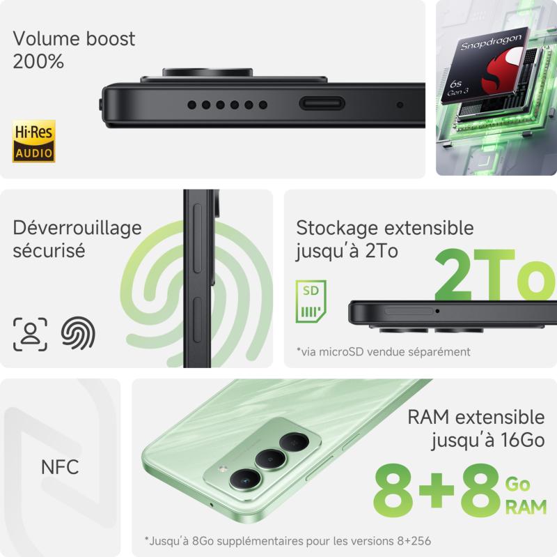 Le smartphone Xiaomi Redmi 15 5G (8 Go / 256 Go) associe puissance, autonomie et confort d'utilisation. Sa batterie longue durée de 7 000 mAh, son grand écran FHD+ de 6,9" jusqu'à 144 Hz et son processeur Snapdragon 6s Gen 3 offrent fluidité et endurance. Son design raffiné, son double capteur photo 50 MP et ses outils d'IA facilitent chaque instant du quotidien.