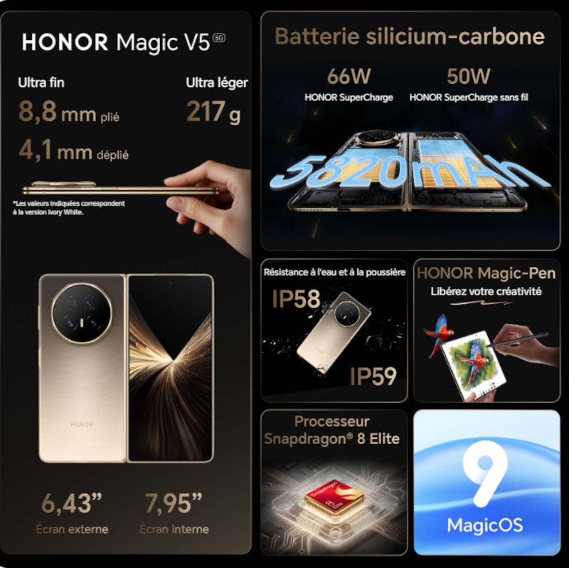Noir, Android 15 + MagicOS 9.0.1, 5820 mAh, Qualcomm Snapdragon 8 Elite, RAM 16 Go, 512 Go