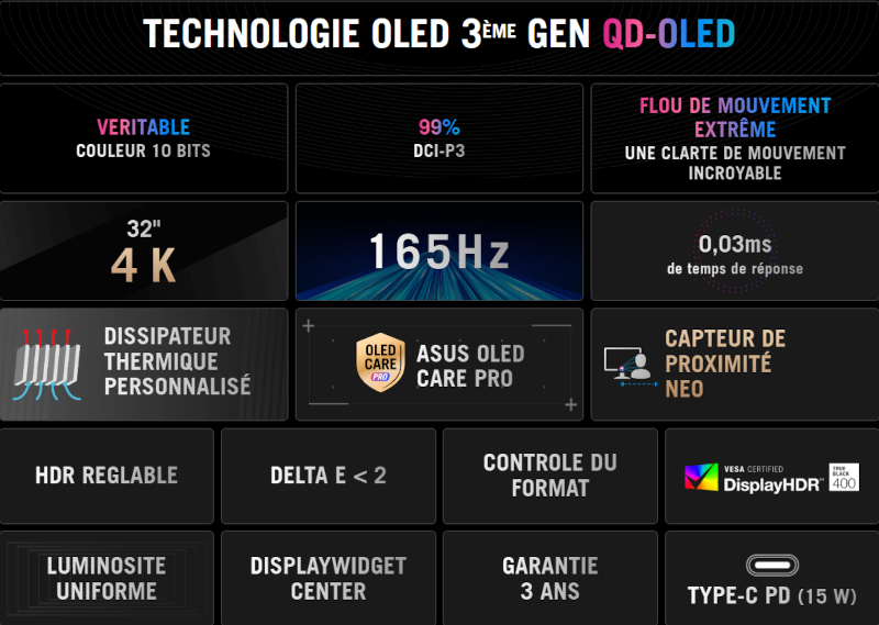 L'écran PC ROG Strix OLED XG32UCDS est un moniteur gaming 32” QD-OLED 4K UHD alliant vitesse extrême et fidélité des couleurs. Avec ses 165 Hz, 0,03 ms et 99 % DCI-P3, il garantit une fluidité et une précision d'image exceptionnelles. Son dissipateur thermique personnalisé, son capteur de proximité Neo et ASUS OLED Care Pro prolongent la durée de vie de la dalle pour une expérience durable et immersive.