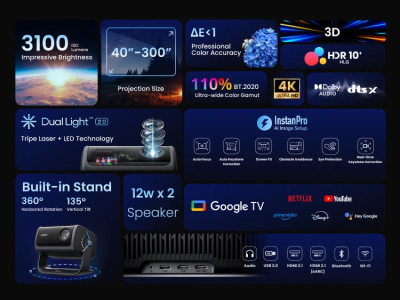 Le vidéoprojecteur Dangbei MP1 Max bouscule le home cinéma : une source hybride Triple laser + LED (NICHIA QuaLas), une image 4K lumineuse à 3100 ISO lumens et une colorimétrie de référence 110 % BT.2020 avec ΔE<1. Ajoutez Google TV avec Netflix licencié, le réglage InstanPro AI et un stand intégré 360°/135° : vous profitez d’une installation instantanée, d’un confort durable et d’un spectacle grand format, chaque jour.
