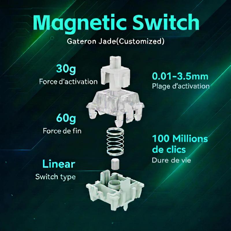 Grâce au Rapid Trigger, les touches se réinitialisent instantanément, rendant chaque action plus fluide, plus rapide et plus réactive. Une avancée décisive pour les jeux compétitifs où chaque milliseconde compte. Ce clavier magnétique devient ainsi un véritable prolongement de vos réflexes.