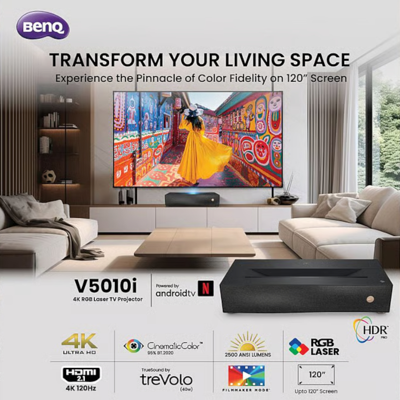 Transformez votre salon en salle obscure avec le BenQ V5010i, projecteur TV 4K UHD à laser RVB 2 500 lm. Ses couleurs couvrant 95 % BT.2020, le HDR10+ / HLG et la technologie HDR-PRO garantissent une image précise jusque sur 120". Côté confort, profitez d’un son 40 W, de la compatibilité eARC, de l’ALLM et du streaming 4K via Android TV et Chromecast.