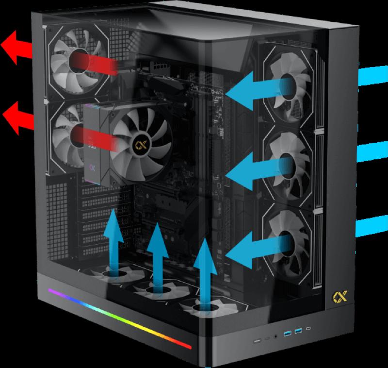 Avec 8 ventilateurs ARGB de 120 mm préinstallés, le boîtier Xigmatek Pano II vous offre une ventilation d’exception dès le déballage. Le flux d’air est optimisé pour maintenir vos composants à bonne température, même en pleine charge. Et avec le kit de contrôle ARGB intégré, synchronisez facilement vos effets lumineux.