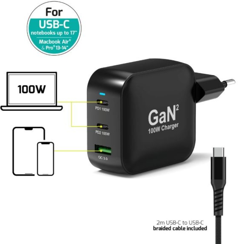 PORT Connect Chargeur Secteur USB-C Power Delivery 100W GaN + Câble 2 m