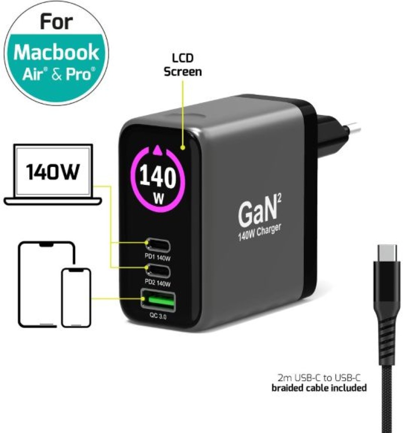 Chargeur Secteur USB-C Power Delivery 140W GaN avec écran OLED + Câble 2 mètres