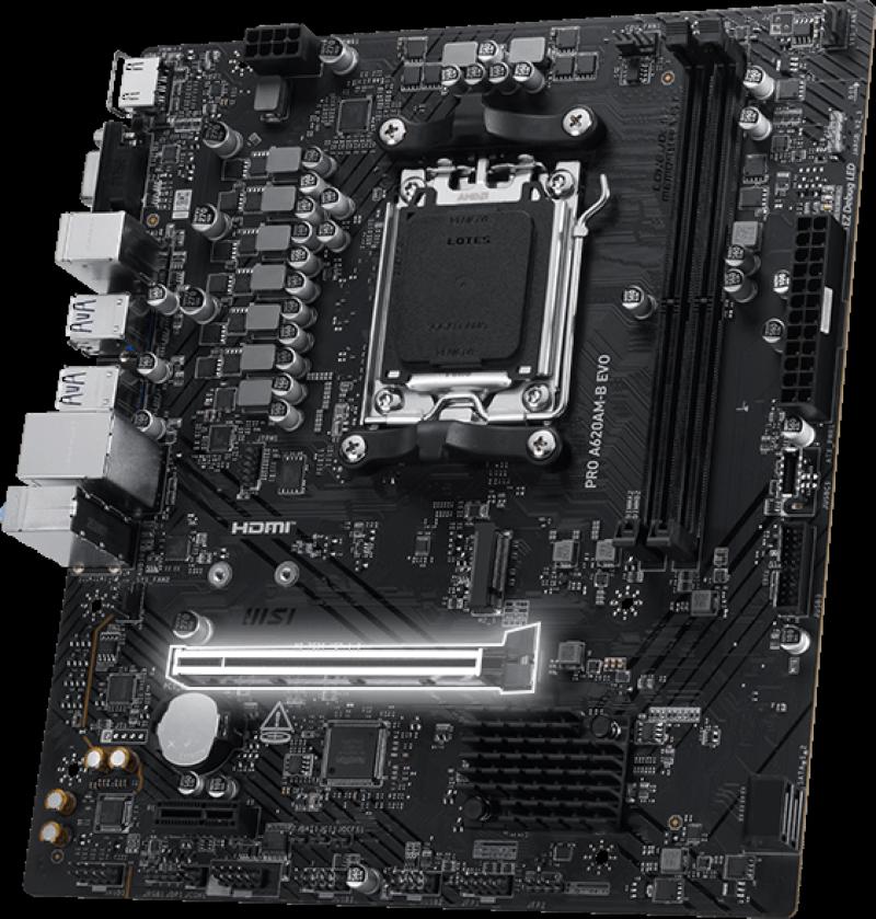 La MSI PRO A620AM-B EVO adopte les dernières avancées en matière de mémoire et de stockage avec le support DDR5 jusqu'à 6800+ MHz (OC) et un slot M.2 PCIe Gen 4 x4 pour des débits jusqu'à 64 Gbps. Grâce à son slot PCIe 4.0 renforcé par la technologie Steel Armor, elle supporte facilement les cartes graphiques haut de gamme.