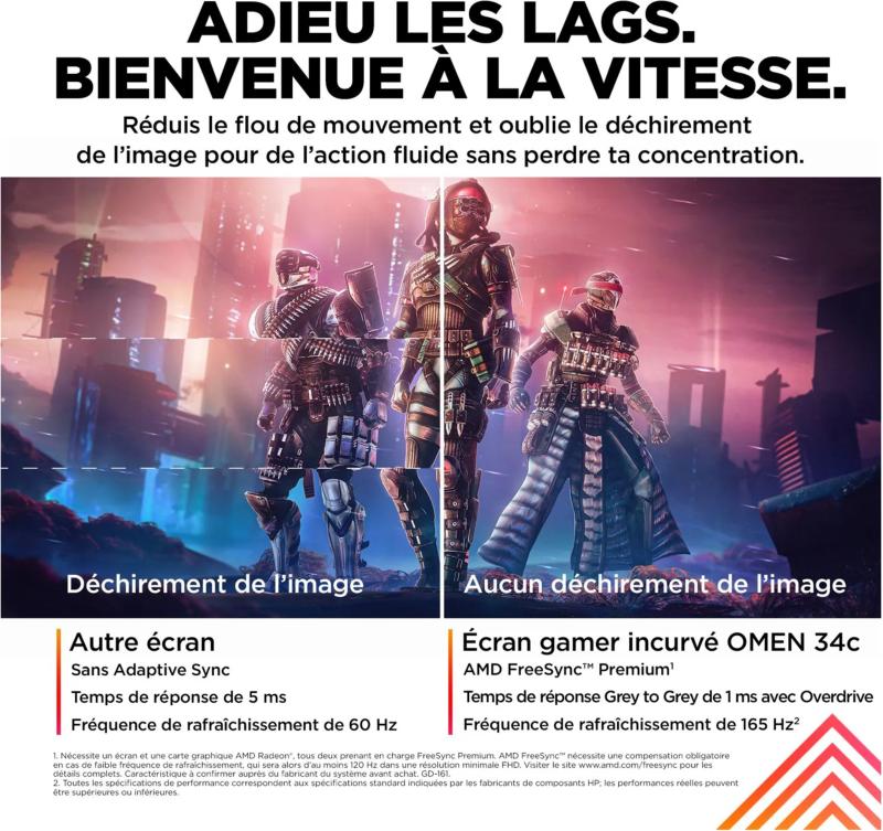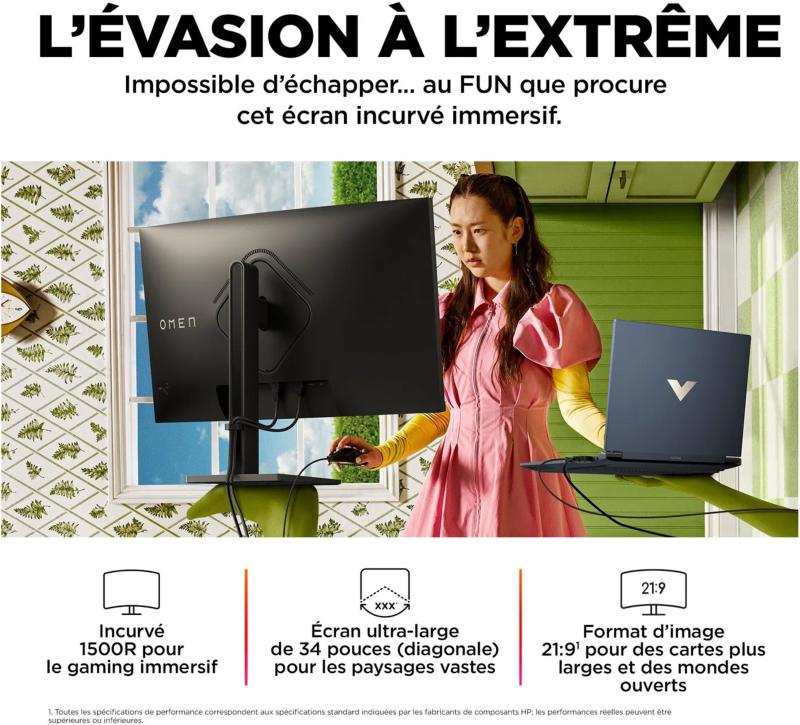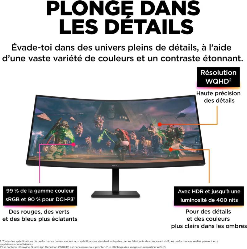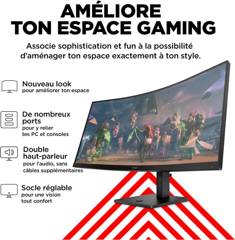 Avec le moniteur HP OMEN 34c, plongez dans une expérience de jeu panoramique grâce à sa dalle incurvée de 34 pouces en résolution WQHD. Conçu pour les gamers à la recherche de performance et d'immersion, il combine une fréquence de 165 Hz, un temps de réponse ultra-rapide de 1 ms, la technologie HDR et la compatibilité AMD FreeSync Premium pour une fluidité exemplaire.