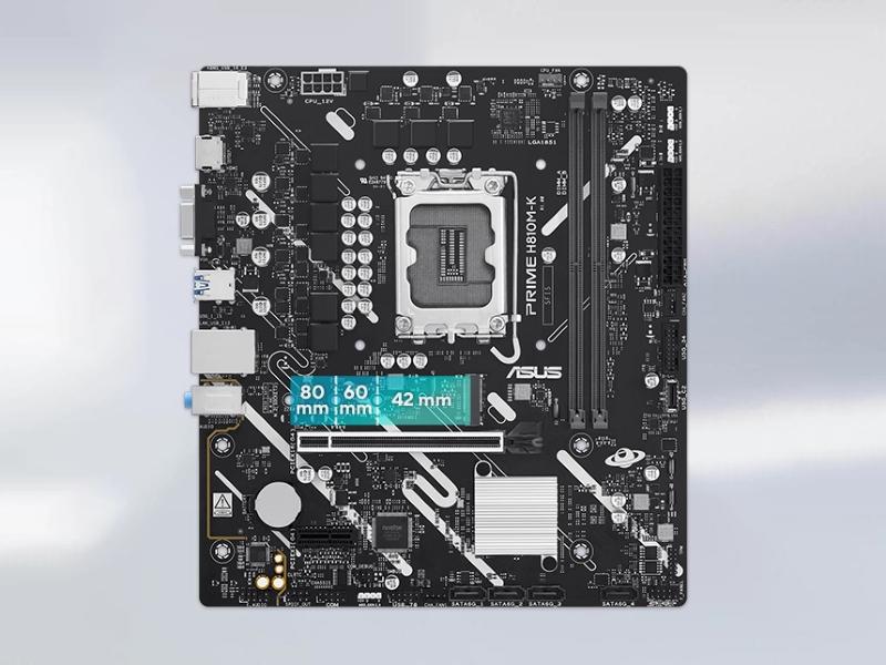Dotée d'un design d'alimentation numérique 6+1+1+1, la carte mère ASUS PRIME H810M-K offre une alimentation stable et efficace aux processeurs Intel Core Ultra de 2e génération. Cette configuration intègre des MOSFET discrets pour un contrôle précis de la tension, idéal pour exploiter la puissance de calcul des dernières générations Intel tout en assurant une fiabilité à long terme.