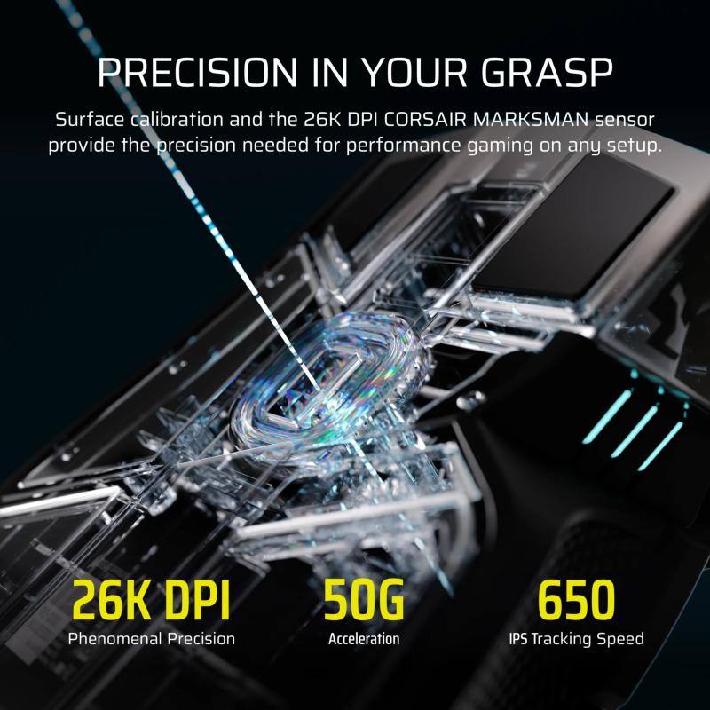 Dotée du capteur optique CORSAIR MARKSMAN 26K DPI, la souris sans fil gaming Corsair Ironclaw Wireless SE offre un suivi précis à 650 IPS et 50G d’accélération. Vos mouvements sont captés instantanément, pour une réactivité à la hauteur des situations les plus critiques. Le calibrage automatique assure une performance stable sur toutes les surfaces.