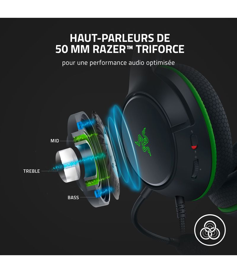 Le Razer Kaira X est un casque filaire pour les consoles Xbox Series X|S conçu pour des performances sonores optimales et une compatibilité multiplateforme. Avec des hauts-parleurs à la pointe de la technologie qui peuvent régler séparément les sons aigus, moyens et graves, un micro flexible capable d'une incroyable captation de la voix et de la suppression des bruits de fond en même temps et de coussinets d’oreilles en mousse à mémoire de forme FlowKnit, il vous accompagnera tout en grand confort dans vos séances de jeu.