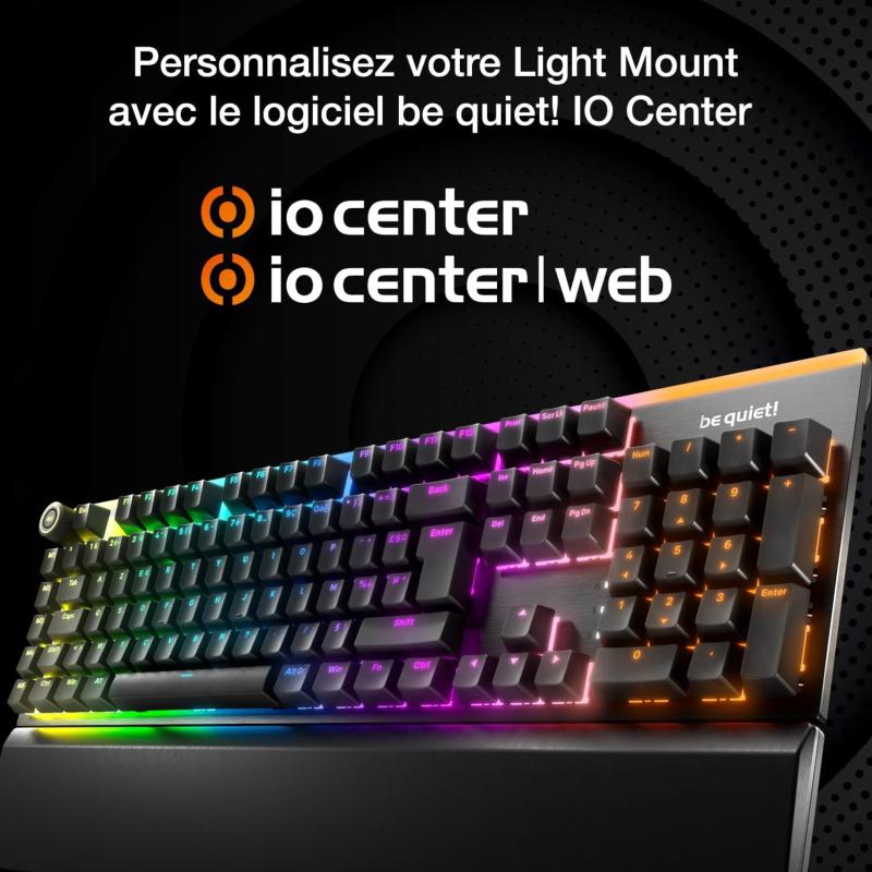 Le clavier gamer be quiet! Light Mount Silent Tactile va au-delà du simple rétroéclairage. Chaque touche est équipée d’un diffuseur arqué intégré, assurant une brillance homogène des caractères PBT translucides. Les bandes LED latérales et supérieures ajoutent une touche d’ambiance unique à votre setup, pour un rendu lumineux spectaculaire et entièrement personnalisable via le logiciel IO Center.
