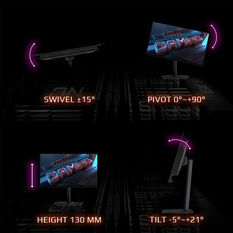 Le moniteur gaming Gigabyte MO27U2 combine esthétique raffinée et praticité avec un pied ajustable en hauteur (130 mm), pivot 90°, tilt et swivel. Il s’adapte à toutes les configurations, du bureau gaming à l’espace de travail créatif. Sa finition anti-reflet garantit un confort visuel même en environnement lumineux.