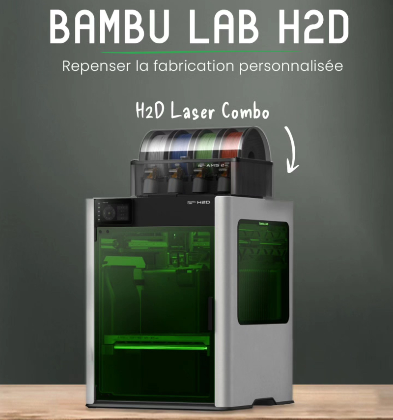 La Bambu Lab H2D Laser Full Combo réunit impression 3D FDM à double extrudeur et module laser 40 W dans une seule machine. Pensée pour les créateurs ambitieux et les professionnels, elle offre un large volume d’impression 350 x 320 x 325 mm et une compatibilité étendue avec les matériaux techniques.