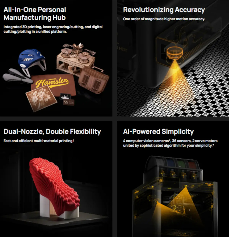 Grâce à sa buse jusqu’à 350 °C, sa chambre chauffée active 65 °C, son calibrage optique haute précision et ses caméras intégrées, elle transforme votre espace de travail en véritable atelier multifonction, précis et évolutif.