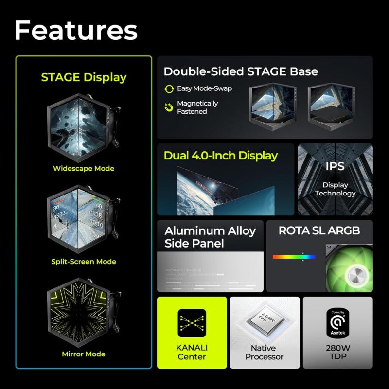 Le TRYX STAGE ARGB 360 est un kit de refroidissement liquide AIO 360 mm qui allie design saisissant, performances thermiques avancées et expérience visuelle interactive grâce à ses deux écrans IPS intégrés. Un choix idéal pour les passionnés de PC haut de gamme, entre style et efficacité.