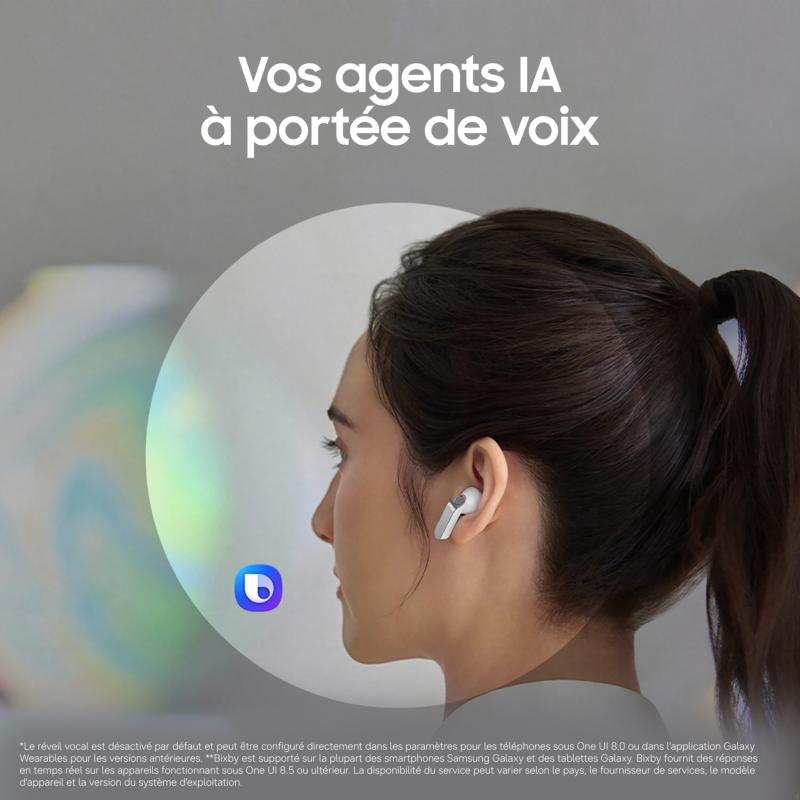 Les écouteurs Samsung Galaxy Buds4 placent l’intelligence au cœur de l’expérience. Grâce au contrôle par gestes de la tête, vous gérez appels, notifications ou alarmes d’un simple mouvement. Le contrôle vocal par IA compatible avec Gemini, Bixby ou Perplexity facilite l’accès à vos fonctions sans les mains, pour un usage naturel et fluide.