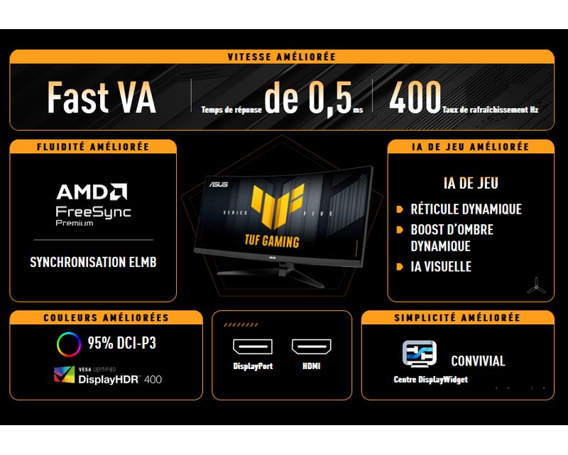 Avec sa dalle Fast VA incurvée 1500R, l'Asus TUF Gaming VG34WQ5A vous plonge au coeur de l'action avec un format 21:9 en UWQHD (3440 x 1440). Son large champ de vision agit comme un cockpit panoramique, idéal pour les jeux immersifs comme pour le multitâche. La certification DisplayHDR 400 associée à une couverture de 95 % du DCI-P3 garantit des couleurs intenses et des contrastes profonds, pour une image vivante et détaillée dans toutes les situations.
